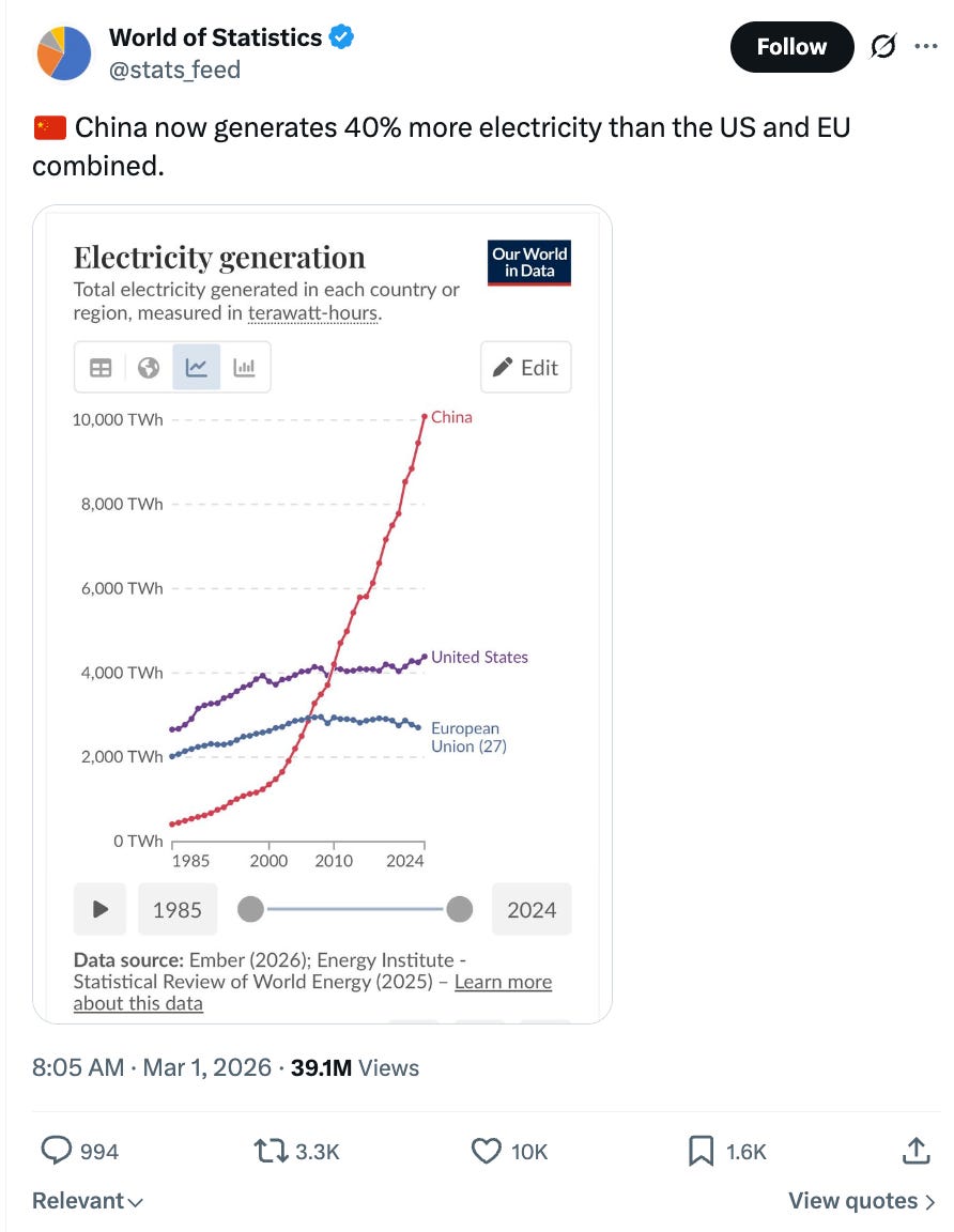 The economics are not purely a software achievement. China’s total installed power generation capacity reached 3,349 GW by end of 2024. Wind and solar alone hit 1,406 GW, surpassing China’s own 2030 target six years early. Clean energy now accounts for 52% of installed capacity. China spent $625 billion on clean energy in 2024—31% of the entire global total. Compute requires electricity. Cheap, abundant electricity makes cheap inference possible. The price gap between Chinese and American AI is partly an energy infrastructure story, built over decades of directed investment. The US, by contrast, faces genuine data centre power constraints. New capacity is queued behind grid limitations that will take years to resolve.