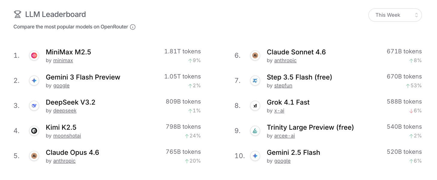 Let’s look at OpenRouter’s traffic data. Three of the six most-used large language models in the world, by actual production volume, now come from Chinese laboratories. MiniMax M2.5 sits at the top. DeepSeek and Zhipu’s GLM follow closely behind. The largest single consumer of AI inference on the open market is OpenClaw, an autonomous coding agent that routes the bulk of its traffic through Chinese models.